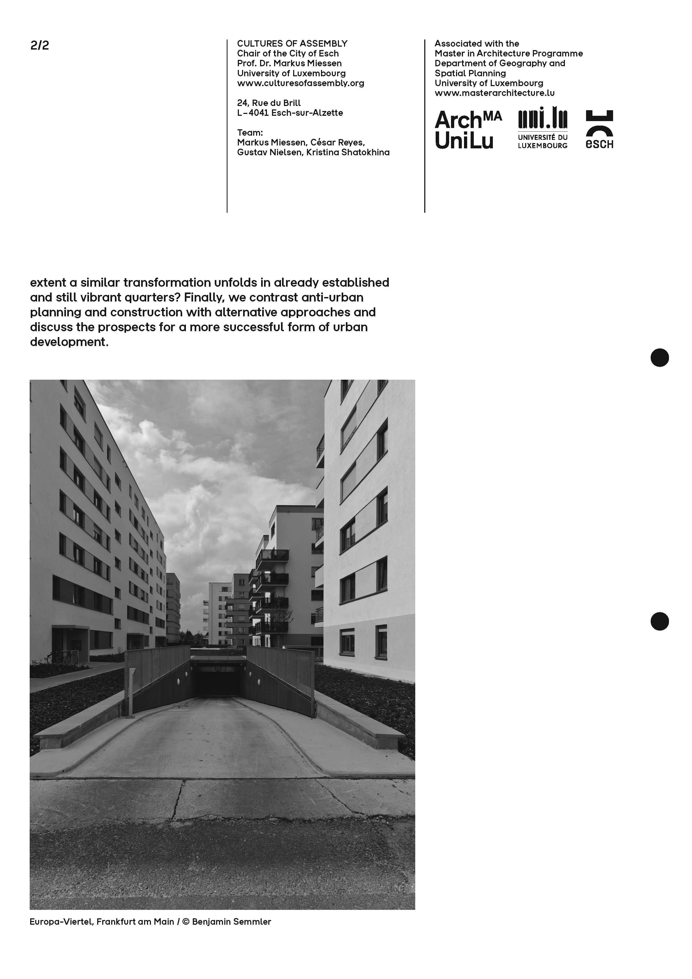 Im Rahmen der Vortragsreihe »Cultures of Assembly« an der Universität Luxemburg stellt Frankfurt Babylon das Europaviertel als Fallstudie einer gescheiterten Stadtentwicklung vor. Anhand von über 15 Jahren fotografischer Dokumentation werden planerische Fehlentscheidungen und sozioökonomische Hintergründe untersucht.